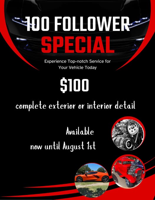 We hit 100 followers!! I know that isn’t much but to me it’s a big deal. After starting this full time only a few months ago, this was a big step for me. I appreciate all the support from local businesses, the community and the many great clients I have met in this so far. As a thank you I’m offering $100 complete interior or exterior detail from now until August 1st. Only have to book the appointment during that time, detail can be scheduled for later date. Extra charge still applies for heavy pet hair and grime. Please share to all your friends